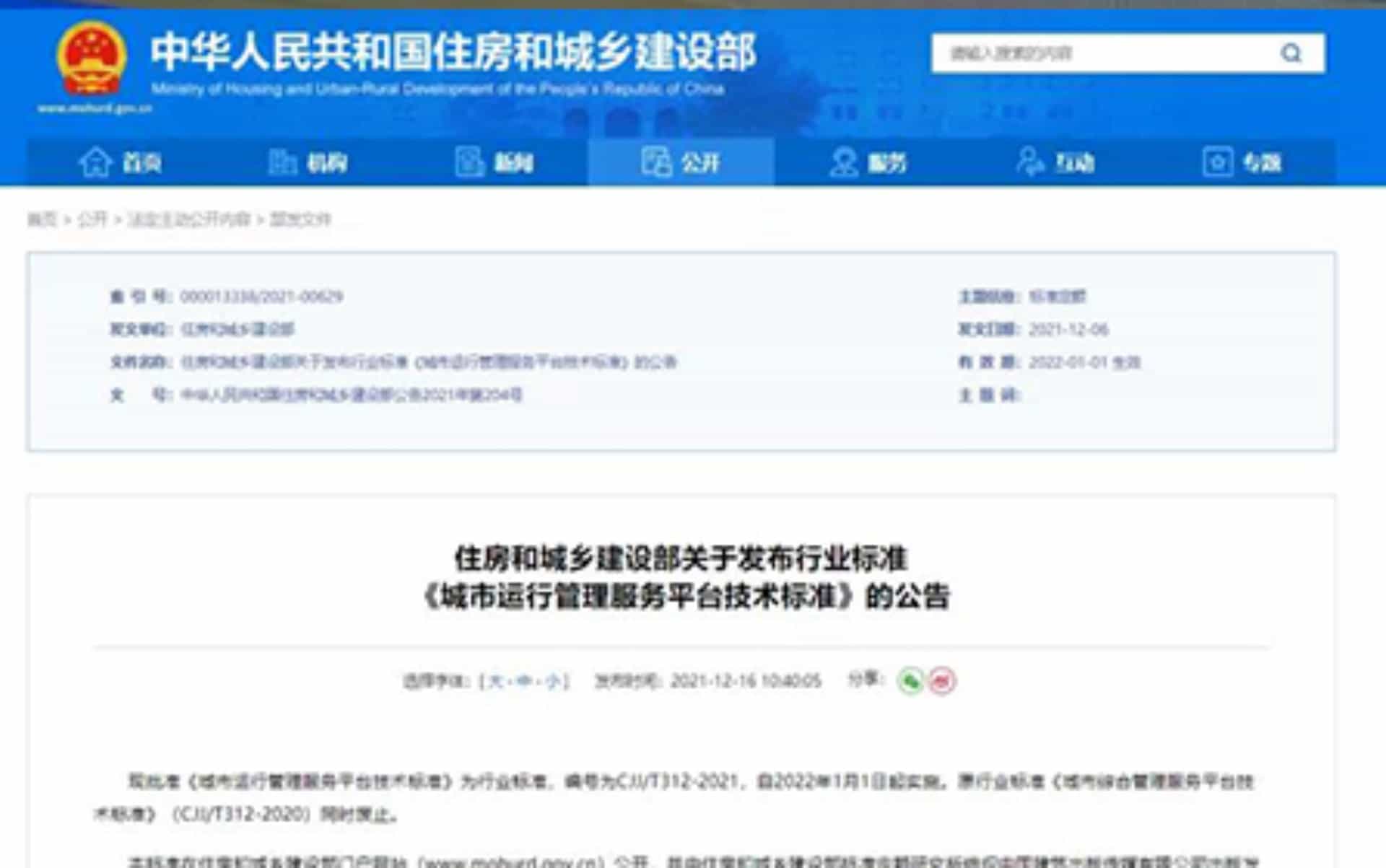 根據(jù)中華人民共和國(guó)住房和城鄉(xiāng)建設(shè)部公告(2020年第80號(hào))文件,行業(yè)標(biāo)準(zhǔn)《城市綜合管理服務(wù)平臺(tái)技術(shù)標(biāo)準(zhǔn)》(CJJ/T3...