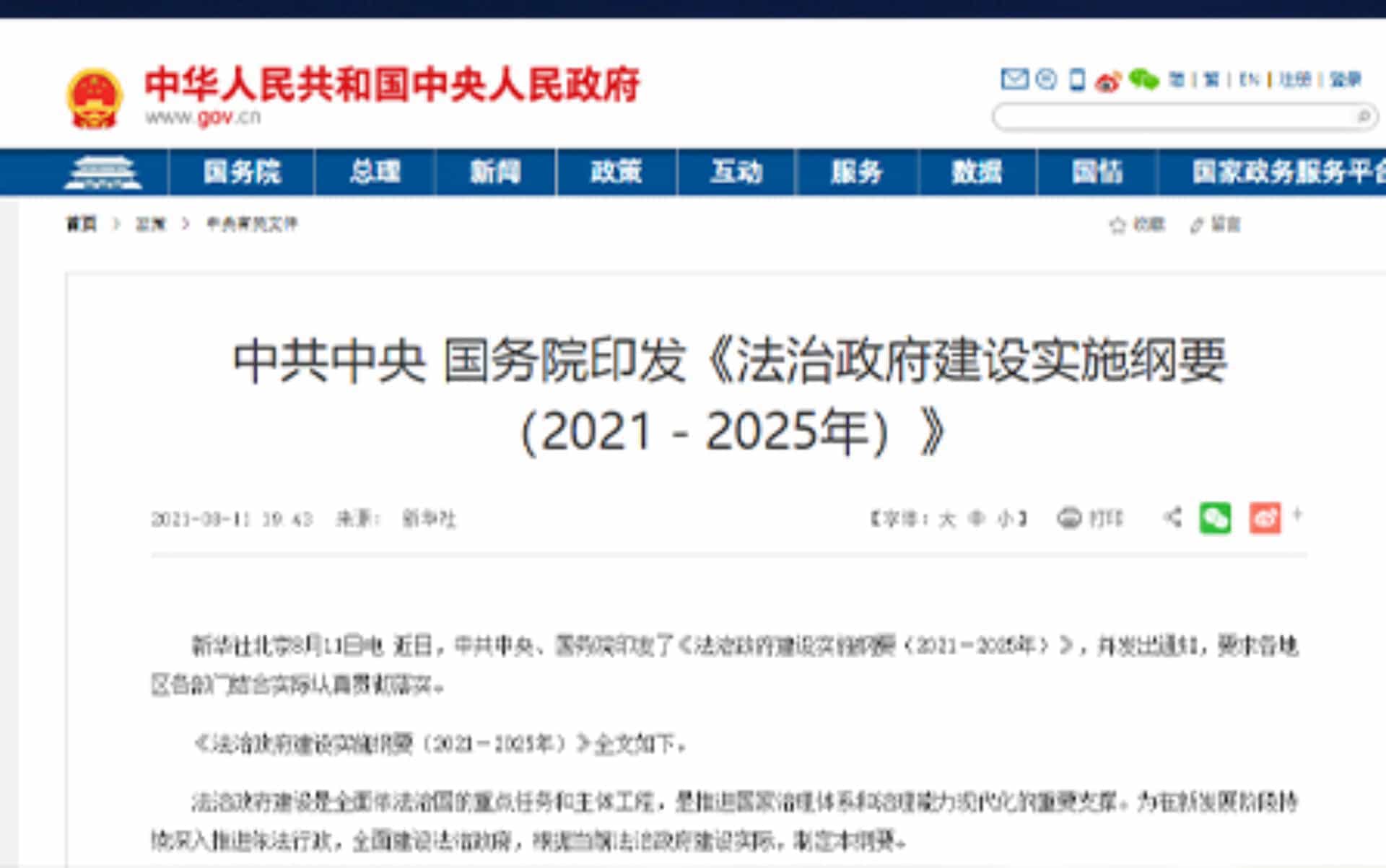 近日,中共中央、國務(wù)院印發(fā)了《法治政府建設(shè)實(shí)施綱要(2021-2025年)》,并發(fā)出通知,要求各地區(qū)各部門結(jié)合實(shí)際認(rèn)真貫...